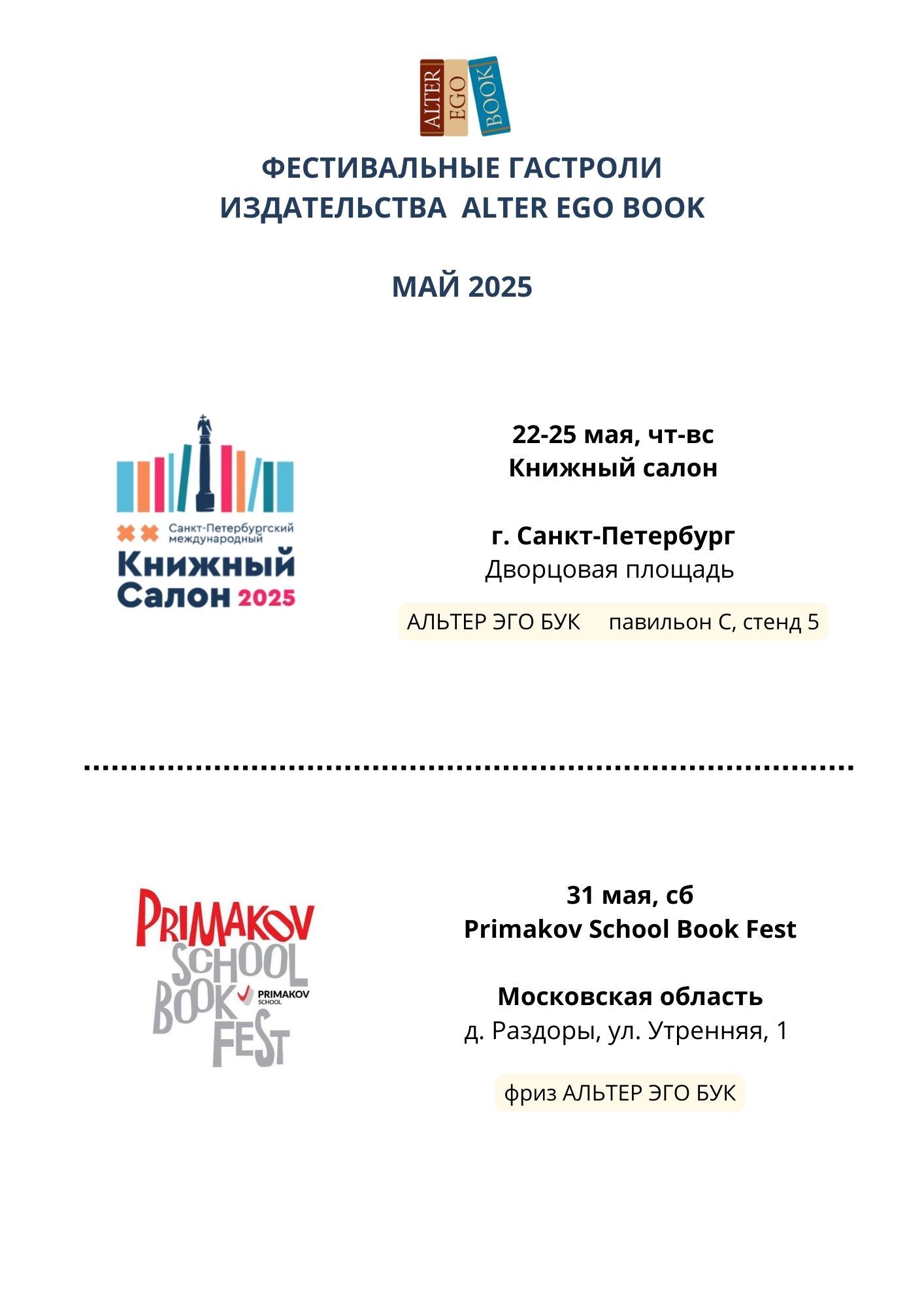 Расписание фестивальных гастролей издательства АЛЬТЕР ЭГО БУК на май - август 2025 года. Список может пополниться, а там, где не указаны стенды — уточниться. Но в целом, на сегодня география именно такова. Этим летом в большинстве случаев едем туда, где раньше не были.